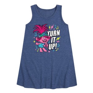 Trolls - Turn It Up Poppy - Toddler & Youth Girls A-line Dress - Step into the whimsical world of the Trolls movie franchise with our vibrant collection of apparel. Crafted with premium materials for comfort and style, our Graphic Garments are perfect for adding a pop of personality to your wardrobe. Whether you're dancing to the beat of your own drum or spreading positivity wherever you go, our Trolls Graphic Garments are sure to brighten your day and spread smiles to everyone around you.