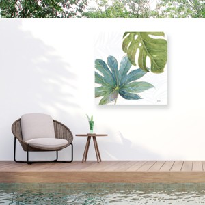 This ready to hang, gallery-wrapped art piece features a painting of teal and green tropical leaves.Lisa Audit loves the art of decoration, and she uses oil paints, acrylics, and pen and ink to create beautiful pieces of art. She finds inspiration from fine art masters such as Picasso, Manet, Rubens and Cezanne. Lisa lives in Canada with her two teenage daughters, and she creates much of her artwork in a spacious studio inside her home.Giclee (jee-clay) is an advanced printmaking process for creating high quality fine art reproductions. The attainable excellence that Giclee printmaking affords makes the reproduction virtually indistinguishable from the original piece. The result is wide acceptance of Giclee by galleries, museums, and private collectors. Gallery wrap is a method of stretching an artist's canvas so that the canvas wraps around the sides and is secured a hidden, wooden frame. This method of stretching and preparing a canvas allows for a frameless presentation of the finished painting.