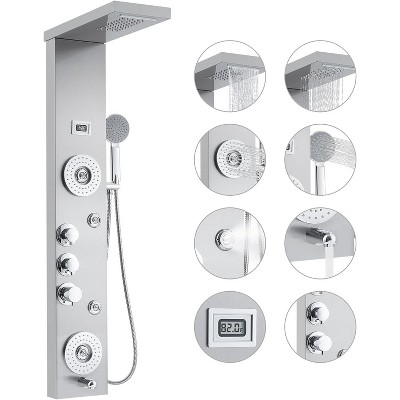 Premium Stainless Steel Shower Panel with LED Display - 3-Function Thermostatic Rain Shower Tower System (Brushed Nickel, Wall Mount)Premium Features:Smart Temperature Control SystemBuilt-in digital temperature displayThermostatic mixing valve prevents scaldingMaintains consistent water temperature (¡À1¡ãF)Visual alerts for unsafe temperature rangesMulti-Function Shower Experience3-in-1 handheld shower with 6" headRainfall, massage, and mist spray patterns360¡ã rotating bracket for flexible positioning59" stainless steel hose includedWater-Powered LED LightingEnergy-free LED illumination systemAuto-activated by water flowSoft blue glow enhances ambianceNo batteries or electrical wiring requiredPremium 304 Stainless Steel ConstructionBrushed nickel finish resists fingerprintsCorrosion-resistant for humid environmentsConceals water spots and minor scratches18.43 lb heavy-duty build qualitySleek Modern DesignSpace-saving vertical tower configurationCompatible with standard 1/2" plumbingIncludes all mounting hardwareFits bathrooms from 32"-48" wideTechnical Specifications:Brand: TROPOWMaterial: 304 Stainless SteelFinish: Brushed NickelDimensions: 36" H x 8" W x 3.5" DWeight: 18.43 lbsWater Flow: 2.5 GPMPressure Requirement: 20-80 PSIIncluded: Shower panel, handheld shower, hose, hardwareWarranty: 5-year limited