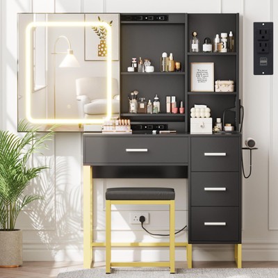 TROPOW Vanity Desk with Mirror and Lights, for Bedroom,Includes Padded Stool, Easy to Assemble, Storage Drawers, USB Outlets, Hairdryer Holder