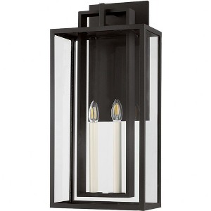 Collection: Amire, Material: Aluminum, Finish Color: Textured Black, Width: 12", Height: 25.5", Length: 12", Depth: 7.75", Backplate Width: 15", Backplate Length: 7.75", Lamping Type: Incandescent, Number Of Bulbs: 2, Wattage: 18 Watts, Moisture Rating: Wet Rated, Desc: Clean lines, negative space, and a minimal rectangular backplate define the layered frame of the Amire sconce. Within the open, airy silhouette, slender off-white candles are encased by clear glass panels, optimizing illumination. The Textured Black finish brings a sense of modern elegance to any exterior. Amire is available as a 1-light sconce or a 2-light sconce in two sizes.,
