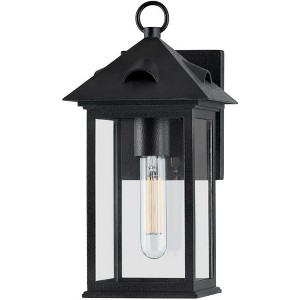 Collection: Corning, Material: Aluminum, Finish Color: Forged Iron, Width: 6.5", Height: 13", Length: 6.5", Depth: 7.25", Backplate Width: 6", Backplate Length: 4.75", Lamping Type: Incandescent, Number Of Bulbs: 1, Wattage: 15 Watts, Moisture Rating: Wet Rated, Desc: Finished in Forged Iron, this classic lantern melds old-world charm with contemporary functionality. The simplified design features four panels of clear glass encasing one or two candles while emphasizing negative space. Rounded roof vent details contribute to the heritage feel of the design. Available in four sizes, Corning suits a number of design styles, from bright cottages to farmhouses and colonial exteriors.,
