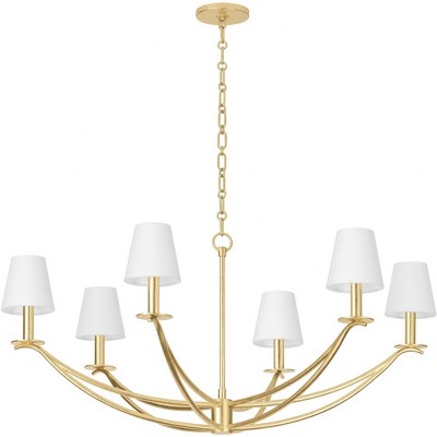 Collection: Gustine, Material: Iron, Finish Color: Vintage Gold Leaf, Width: 31", Height: 18.75", Chain Length: 72", Lamping Type: Incandescent, Number Of Bulbs: 6, Wattage: 8 Watts, Moisture Rating: Damp Rated, Desc: Graceful downward sweeping arms straighten and extend into square metal accent tubes that hold cream-colored candle sleeves, creating an elegant look that is effortlessly useable. Both finishes add texture, with the Vintage Gold Leaf bringing warmth and the Forged Iron a more dramatic feel. The sconce and the chandelier are each available in two sizes and both finishes to fit any interior space.,