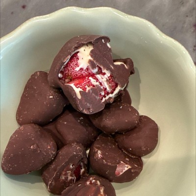 Tiny frozen pieces of heaven!!! The dark chocolate with the strawberries is amazing. You can let them thaw out a little, if you can wait that long, lol! They’re so indulgent that you only need a few to feel completely satisfied.