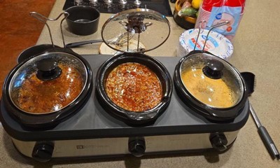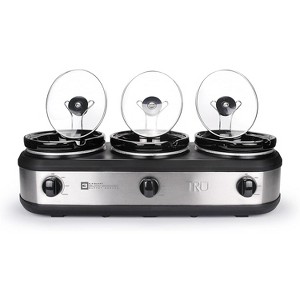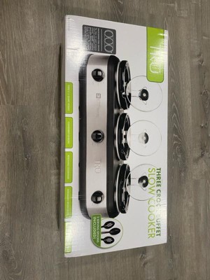 [This review was collected as part of a promotion.] The Tru triple slow cooker has been perfect for parties. Each pan is big enough for large portions and they have their own temperature dials. The set also came with serving spoons. No more using the old foil trays with messy burners!