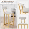 Gold Bar Stools Set of 2 with Back ¨C Modern Kitchen Counter Height StoolsErgonomic Comfort DesignT-shaped backrest (12.2"L x 4.7"W) with 75¡ã recline angle16.1" x 14.2" velvet seat with 2" high-density foamSturdy Metal ConstructionU-shaped metal base with non-slip padsHorizontal footrest bar for added comfortPrecision Counter Fit26.4" seat height for 36"-40" countersDimensions: 16.5"D x 14.6"W x 35.4"HPremium UpholsteryGold linen velvet (easy to clean)Rectangular seat shapeEasy AssemblyIncludes tool kit + instructions22.27 lbs per stool