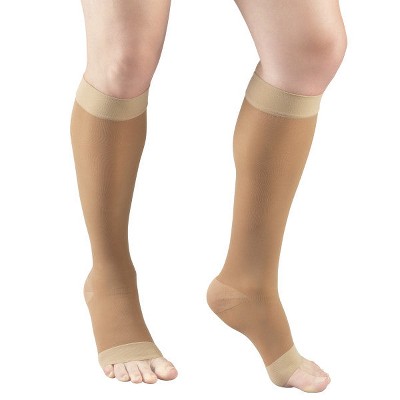 Truform 0878 was created to help relieve conditions associated with poor circulation. Graduated compression technology delivers a compressive action to the leg that is greatest at the ankle, then gradually decreases toward the heart. The 15-20 mmHg Firm compression level is great for post surgery and severe edema, varicose veins, spider veins, hypotension, post thrombotic syndrome (PTS), post sclerotherapy, and more. Truform therapeutic medical stockings feature classic styling and a smooth knit fabric that helps conceal unsightly conditions. The open toe feature allows for easy toe inspection and permits one standard size to fit a variety of foot dimensions. Color options are basic neutrals for all-occasion wear. Truform stockings, socks and pantyhose feature Graduated Compression Technology, which delivers a compressive action to the leg that is greatest at the ankle, then gradually decreases toward the heart. Graduated compression provides two primary benefits: it helps reduce and prevent swelling for the wearer, and the compression action help to prevent the slowing of blood flow so it can flow more quickly up the leg back toward the heart. Truform graduated compression support hosiery helps maintain positive circulation and leg health. We take the extra time and effort necessary to insure a therapeutically effective, comfortable fit. The combination of state-of-the-art materials and equipment, plus knitting know-how sets Truform apart from the crowd to make your legs look and feel great.