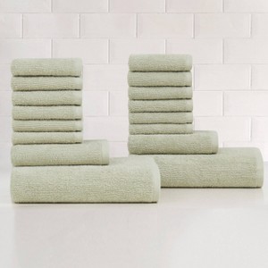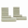 The set includes two bath towels, two hand towels, and an impressive twelve washcloths, perfect for daily beauty routines and personal care. Includes: two bath towels 27 by 52 inches, two hand towels 16 by 26 inches, and twelve wash cloths 12 by 12 inches. All items in this towel set are made from 100% cotton with a woven textured face.