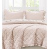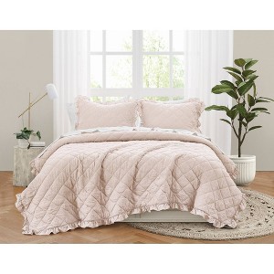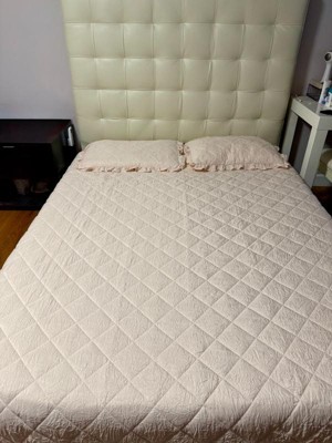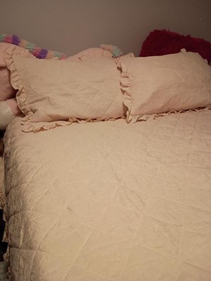[This review was collected as part of a promotion.] Loving the Truly Soft Crinkle Ruffle 3 piece set in the color Blush. First off, it’s super soft, more than I expected it to be. The crinkle pattern in pictures made me think it might be a bit rough or scratchy, but it's not at all! The texture is so light and soft and just really cozy. It's very breathable, making this perfect for the current in-between summer/fall weather. The color is a really pretty light blush, and the little crinkle design is actually adorable, it looks clean and stylish. I have a full size bed, and the quilt is a bit big for it, which makes sense since this is for full/queen. Overall, this is 10 for me, for the texture, the breathability, and color.