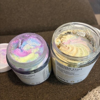 Not the same scent as the unicorn fruit body polish (the shower one) or at least mine isn’t. Completely different fragrance and smells like a childrens fruity chapstick. Came melted and mixed up super weird, not like the photo at all. I’m disappointed because I LOVE the body polish from this brand and the smell/texture. This lotion is another story. It’s not whipped, it’s more of a curdled butter texture and it’s very waxy. I ordered online and maybe shouldn’t have because it melted. The colors are also completely different than the picture and the body polish