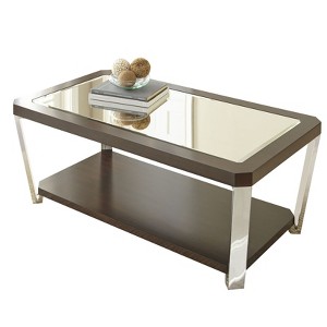 Build a home decor look that celebrates your unique style with the Truman Cocktail Table from Steve Silver Co. This attention-grabbing wood cocktail table has a beveled-mirror tabletop set in an espresso-finished wood frame, and the metal legs provide a pleasing sense of contrast and a touch of shine. The bottom shelf offers storage space for your books and games, and the distinctive design provides a polished look you'll love.