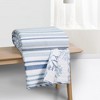 The Truro Reversible Throw by Levtex Home is inspired by blue ocean waters. Offered in blue and white, this design will immediately transform any room in your home. This throw features contemporary coastal stripe design on the front, reversing to a watercolor coral in shades of blue on the back. The Throw (50x60in.) has a cotton front and cotton back, filled with a cotton-rich filler, and is machine washable. Enjoy this for years to come!