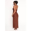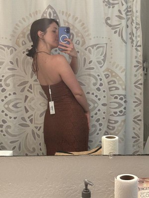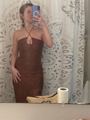 Designed to make a statement, this bodycon dress features a flattering midi length and a halter neckline with a chic tie-close detail that exudes sophistication.
