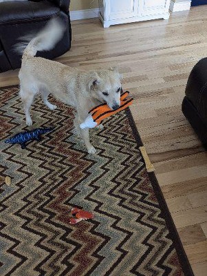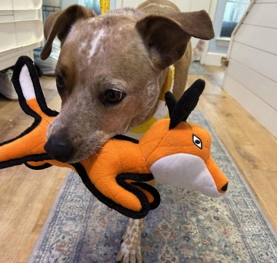 Luna loves her fox Tuffy toy. It's the perfect size for her to carry around