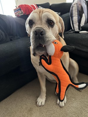 Our dog likes her Tuffy Fox. Fox is durable and has been okay with numerous bites to the nose. It is a bright color and makes for a good little surprise gift for the special dog in your life.