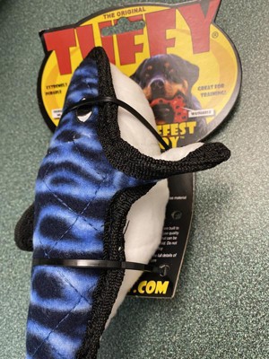 The Tuffy Whale is a durable, yet soft toy for dogs of all sizes. The Tuffy Whale is made with multiple layers of material that are bonded and sewn together to make one "Tuff" Layer. Each toy is then stuffed with safe, non-toxic fiber and sewn with multiple rows of stitching for extra strength and durability. The Tuffy Whale has a squeaker, sewn inside a protective pouch, for your dog's safety and to provide hours of fun and entertainment. Tuffy dog toys can also float and are best used as interactive play toys and not chew toys. Machine wash / Air dry.