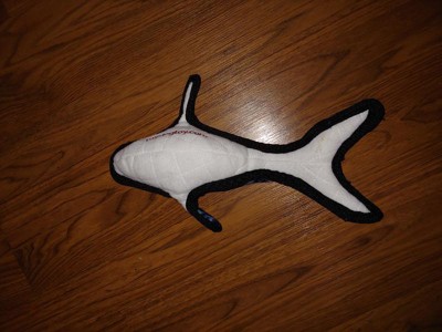 The whale is a great roughed looking toy. It is a great shape and the tail is apparently fun when you want to flip it in the air. This has nice bits (tail and fins) to grab onto and gnaw on. This is a great size for our large dog (100 lbs) to have fun with. She knew immediately that this was a dog toy and was excited to play with it. I hope this lasts as long as other toys we have gotten from this brand.