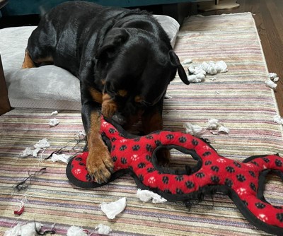 My Rottweiler destroys toys within moments of getting them. Even the tough to destroy kind. She at least has to work a little harder to gleefully rip the stuffing and squeakers out of Tuffy toys.