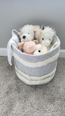 Help keep your little one's essential items within easy reach with this Tufted Canvas Round Storage Bin from cloud island™. This round storage bin brings a playful, contrasting look to your child's playroom or baby's nursery. It features a gray canvas construction that's decorated with tufted, cream-colored stripes for a touch of fluffy texture and added visual interest. This practical storage bin is designed with two attached handles for easy portability, allowing you to move it anywhere around the room to keep their toys, books, stuffed animals, and other essentials organized.