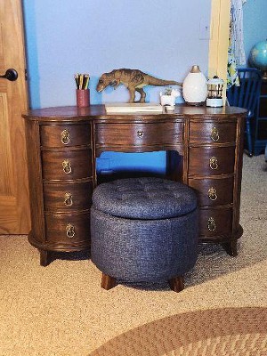 A: I hope this question is for the ottoman I ended up with. Mine is the one with 16 buttons on the top. The diameter is 18.5". The height is 13.75" without legs and 17.75" with legs. If you are asking for storage capacity - it is 10" deep on the inside and 15" wide. (The top uses up that height with the padding.) I'm storing all the yarn for my son's afghan in it (plus the little part I've done already with the knitting needles.)