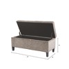 This modern storage bench accentuated with button tufting provides ample storage and features an elegant gray colored soft fabric with black noir legs. Assembly Required.
