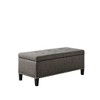 This modern storage ottoman accentuated with button tufting provides ample storage and features an elegant grey linen fabric with black noir legs. Assembly required.
