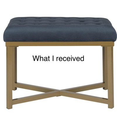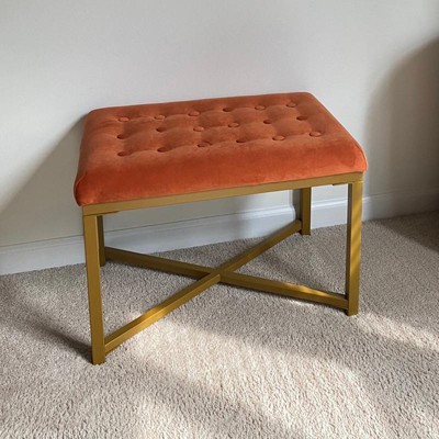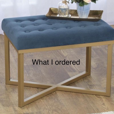 Embrace modern luxury with this metal bench velvet seat. This soft tufted velvet ottoman over a metal base performs multiple functions in any home. Use this velvet ottoman to prop up feet in a family room, to display favorite books in a living room, or to seat an extra guest in the dining room. Multiply the impact by pairing two together at the end of a bed or in front of a favorite place to lounge. Available in a variety of colors, this metal bench is easy to assemble and maintain. Please note that fabric and wood colors may appear slightly different due to variations in lighting or screen settings.