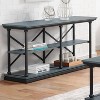 Mixing materials and style influences, this industrial sofa table is an eye-catching design that works in rustic, urban, and contemporary settings. It boasts a wood grain tabletop and open lower shelf supported with black finish metal legs and braces that add to its rugged look. Lovely augmenting a sofa or decorating an entryway, this sofa table is perfect for everything for showing off art or creating a place to set down daily essentials.