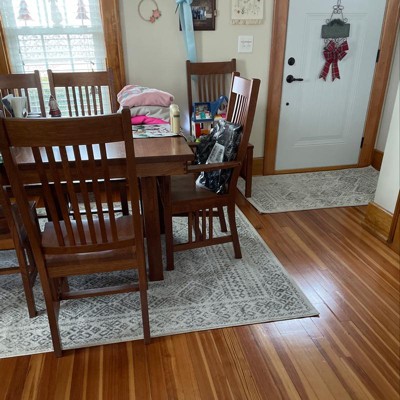 Great sized rug and a very nice design. Easy to spot clean. I did have to buy a rubber mat to keep it in place because it’s slips around the tile.