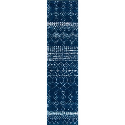 Transform your hallway or entrance with this elegantly crafted runner rug, sized at 2'-0" x 7'-0". Its navy and ivory colors create a soothing and stylish look that complements any decor. Made in Turkey, this power loomed rug is crafted from a blend of 60 percent polypropylene and 40 percent jute, offering a soft texture that feels delightful underfoot. Its bohemian style provides a chic and trendy touch, perfectly balanced with a convenient 3/8 inch height for easy placement under furniture or in busy areas. Enhance your space with this versatile and eye-catching runner rug that combines beauty with function.