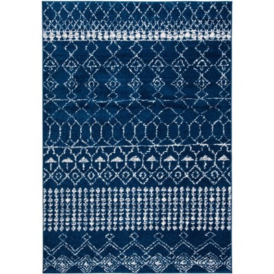 Introducing the perfect addition to elevate your space. This bohemian-inspired area rug, sized at 2 ft by 5 ft, combines rich navy and ivory hues to create a visually stunning aesthetic. Crafted in a small rectangular shape with a height of three eighths of an inch, this rug seamlessly fits into various spaces, enhancing their charm.
