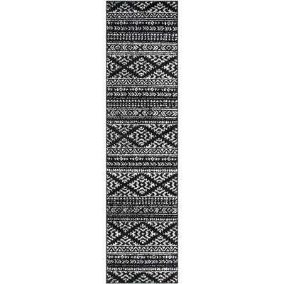 Transform your hallway into a masterpiece with our runner rug, expertly crafted in Turkey. Measuring 2 feet by 8 feet and with a sleek height of three-eighths of an inch, this piece adds a touch of elegance and comfort to your space. The black and ivory tones seamlessly blend with any decor, while the lack of a fixed pattern offers a sense of understated sophistication. Designed with a bohemian flair, it invites warmth and character into your home.