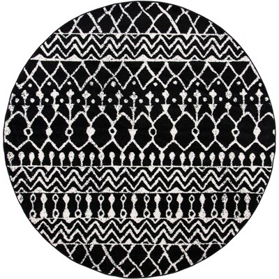 Introducing our exquisite round area rug, crafted to enhance any space with its versatile appeal. Measuring 8 feet by 8 feet, this rug boasts a harmonious blend of black and ivory shades that fits seamlessly into any decor. Its 3/8 inch height promises a comfortable underfoot experience.