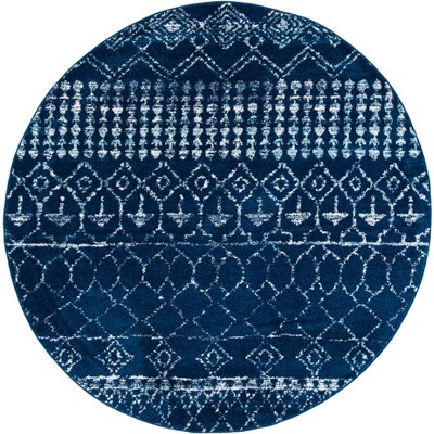 Discover the charm and elegance of this round area rug, measuring 3 feet across with a height of 3/8 inch. The rich navy and ivory tones create a stunning visual that complements any room and the transitional style effortlessly fits both modern and traditional decor. Crafted in Turkey, this rug is power loomed using a blend of 60 percent polypropylene and 40 percent jute, ensuring a soft touch underfoot. Its simple yet sophisticated design adds a touch of elegance without overwhelming your space. Perfect for adding warmth and texture, this area rug is the ideal choice for your living room, bedroom, or entryway. Experience the beauty and craftsmanship that this exquisite rug brings to your home today.