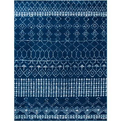 Elevate your living space with this elegant transitional style area rug. Measuring 9 feet by 12 feet, its inviting navy and ivory palette blends effortlessly into any decor. The large rectangular shape, with a height of 3/8 inch, creates a comfortable foundation for gatherings. Crafted in Turkey with a power loomed weave, this rug combines polypropylene and jute for a soft yet durable finish. The absence of a pattern gives it a clean and sophisticated appearance, allowing it to complement a variety of interior styles. Whether placed in the living room or bedroom, this rug adds a touch of refinement to your home.