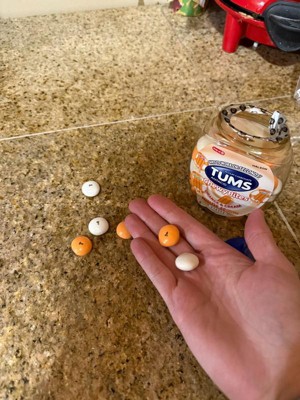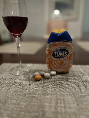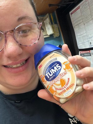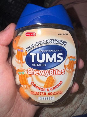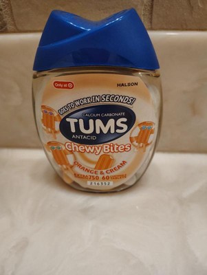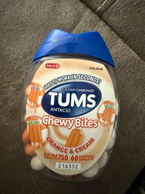 - CONTENTS: 60 TUMS Chewy Bites Antacid Tablets in orange and cream flavor