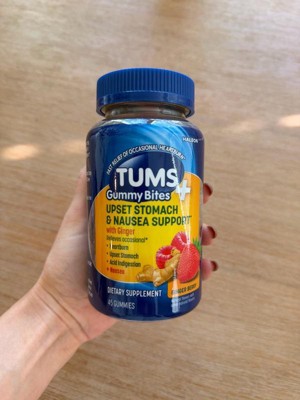 - TUMS+ Upset Stomach & Nausea Support come in a gummy format that are soft and easy to chew