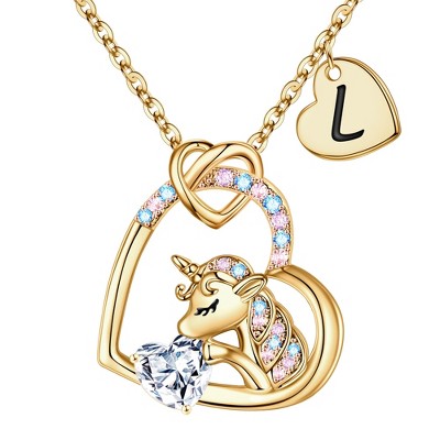 Turandoss Gold Heart Unicorn Necklace for Girls - Dainty Initial Zircon Pendant Necklace for Kids 4 -13 Year Old, Unicorn Birthday Gifts for Girls, A