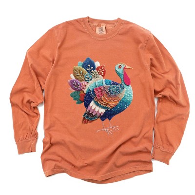 Product Name: Turkey Patchwork Print - Women's Garment Dyed Long Sleeve Graphic T-Shirt