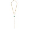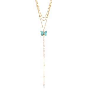 The Turquoise Butterfly Pearl Chain Lariat Necklace features a single turquoise butterfly pendant paired with elegant freshwater pearls on a delicate chain.