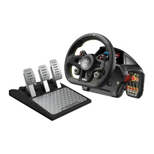 Shift into a new level of realism with the Turtle Beach® VelocityOne® Race Wheel & Pedal System engineered for high-fidelity racing simulation performance on Xbox consoles & Windows PCs. The K: Drive™ 7.2Nm force feedback motor delivers ultra-realistic force, and Dynamic Brake Tek™ load-cell brakes provide true-to-life braking performance. Monitor real-time race telemetry data and customize controls using the Race Management Display™ and for even more customization, the VelocityOne® Control Unit™ has additional remappable buttons. Plus, you can use the Tuner companion app to remap controls and make performance adjustments. Designed for ultimate racing immersion VelocityOne® Race also has Magnetic Paddle Shifters, a hand-stitched leather wheel, aluminum pedal set and race-inspired controls.