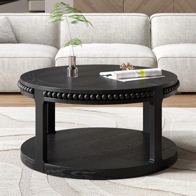 TUYOHW 2-Tier Round Solid Wood Coffee Table, 100LBS Per Tier Heavy-Duty Center Table, Rustic Wood Desktop Living Room Table with Storage Shelf, Black