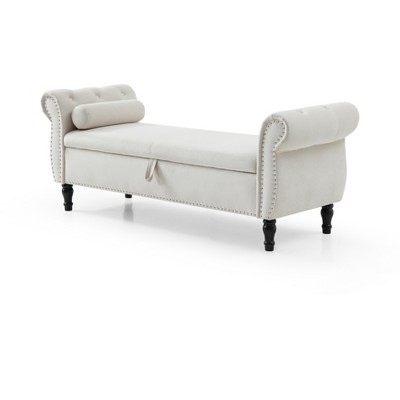 TUYOHW 63" Storage Bench with Button Tufted & Pillow Velvet Upholstered End of Bed Bench with Wood Legs Entryway Bench for Living Room, Bedroom, Beige
