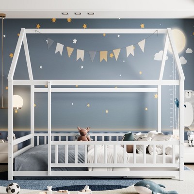 Product Name: TUYOHW Montessori Floor Bed with Slat Support for Kids,Solid Pine Wood Bed Frame,Slatted Low Profile Bed with Doors,300lbs Capacity,Full,White