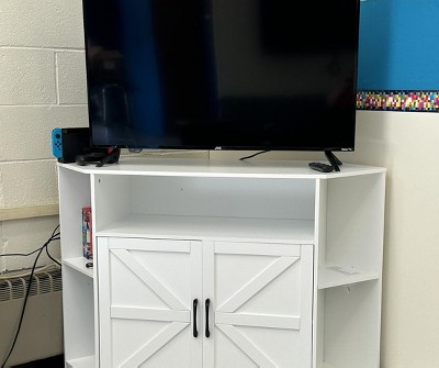 Tv Stand for 55 Inch Tv, Corner Tv Stand with Power Outlet, Farmhouse Corner Tv Cabinet with Adjustable Shelves, Corner Entertainment Center with Barn Doors for Living Room