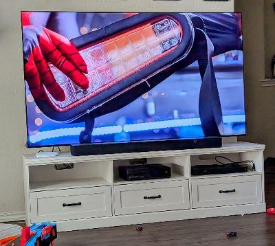 This fit our 77" TV perfectly. I like that it has a simple design that doesn't overwhelm the bulkiness of a large size TV. The quality was excellent. Our previous TV stand was an IKEA stand and this one is surprisingly more sturdy. The instructions were clear, but you do need to have some experience in putting together furniture before embarking on this project. It took my husband around 4 hours to build this and it took a lot of focus. You have to be mindful of not over tightening the screws because it can split the wood ( we learned this from experience from our previous projects that we messed up). The back panel on this stand is one of the strongest back panels I've come across from around our 4 other self-assembled cupboards and stands from various brands, including IKEA.