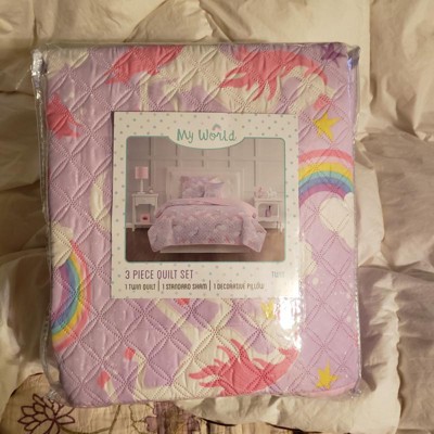 Twin 3pc Rainbow Unicorn Kids' Quilt Set Purple - My World: Girls Twin Bedding, Modern Microfiber, Teen Decor