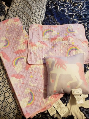 [This review was collected as part of a promotion.] This Unicorn quilt set is as cute as the package looks. I am generally leery of using "bed in a bag" products due to the quality of the items, especially pillows that are included. I was very surprised when the pillow that came with this was full and fluffy. The unicorn details are perfect for little ones with beautiful soft colors. When my daughter saw the package she was beyond excited. The pillow case that came with this perfectly fit a regular size pillow without having that annoying extra room. The quilt itself was not as dense as other quilts however, it's perfect for the Florida weather that my family is use to.