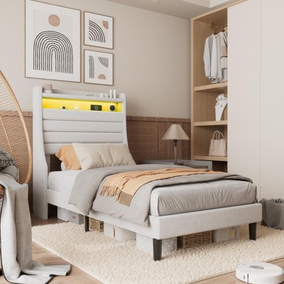 Twin Bed Frame with Charging Station, Twin Size Platform Bed Frame with LED Lights, Modern Upholstered Bed Frame with Headboard, No Box Spring Needed, Easy Assembly