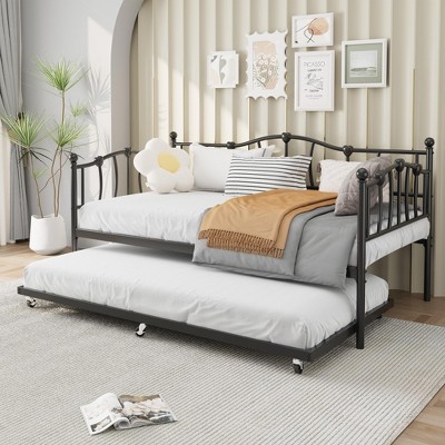Twin Daybed Sofa Bed Frame with Trundle, Lockable Casters, Metal Platform Bed for Living Room Bedroom Guest Room Apartment, Pink